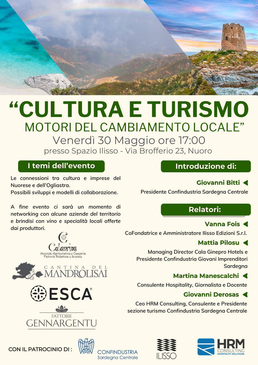 Venerdì 30 maggio alle ore 17:00 nella sede di Spazio Ilisso a Nuoro si terrà l'evento "Cultura e turismo: motori del cambiamento locale" dedicato a confrontarsi sulle potenzialità degli attrattori culturali e turistici quali leve di sviluppo e di crescita delle comunità e dei territori. L'iniziativa è promossa dalle nostre aziende associate HRM Consulting e Ilisso Edizioni con il patrocinio della nostra Associazione. L'obiettivo è mettere in luce le connessioni tra asset culturali e imprese esplorando nuove sinergie e modelli di collaborazione. L'evento è aperto a imprenditori e a tutti gli interessati.