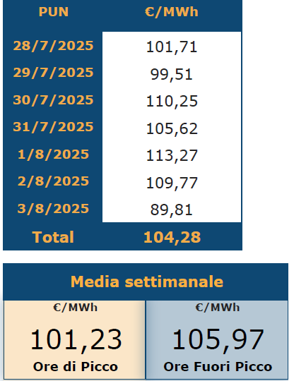 Buone notizie: agosto ha chiuso a meno delle previsioni, con una correzione della media dai 111 Euro MWh previsti a 108,7 Euro MWh. L'ultima settimana (28 luglio/3 agosto) è stata pari a 104,28 Euro MWh.