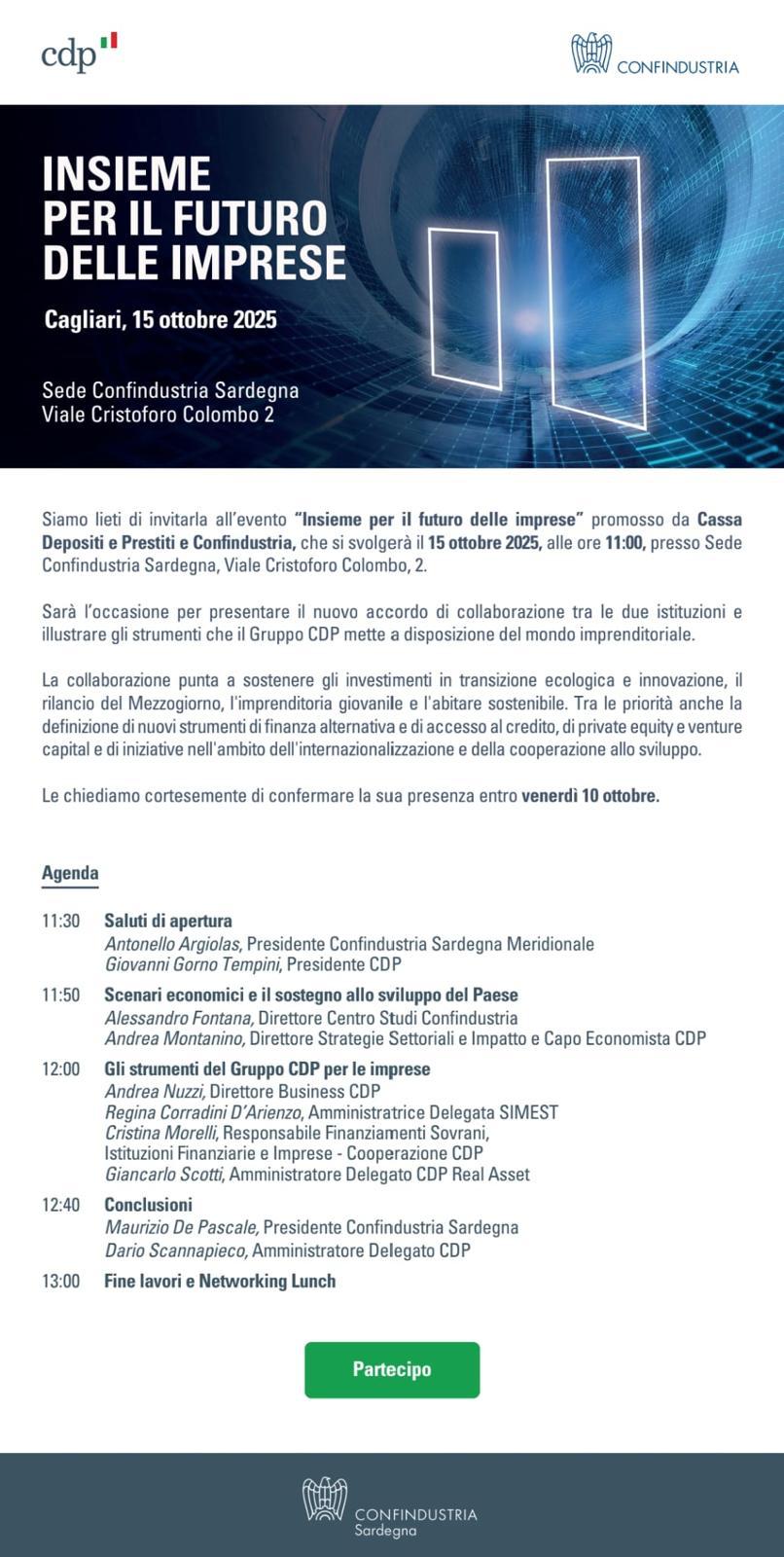 CDP e Confindustria insieme a Cagliari mercoledì 15 ottobre