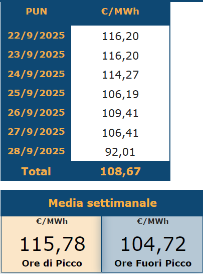 Nella settimana chiusa il 26 settembre 2025, il prezzo del CAL-26 italiano ha evidenziato un calo di 0,95 €/MWh (-0,89%), oscillando tra un minimo di 105 €/MWh e un massimo di 106,01 €/MWh.