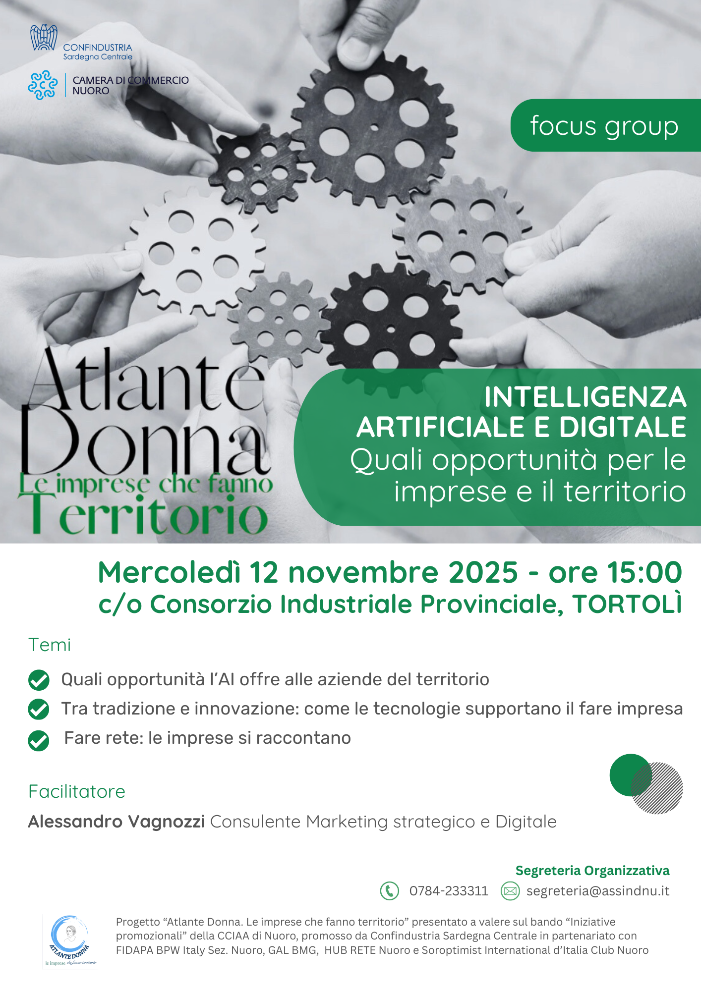 Quali opportunità l’intelligenza artificiale offre alle aziende del Nuorese e dell'Ogliastra e come le nuove tecnologie digitali supportano il fare impresa nel territorio. Sono questi alcuni dei temi al centro del secondo focus group promosso nell'ambito del progetto "Atlante Donna. Le imprese che fanno territorio" nato per valorizzare le imprese femminili e il ruolo delle donne nelle aziende nel Nuorese e in Ogliastra. Il secondo appuntamento dal titolo "Intelligenza artificiale e transizione digitale. Quali opportunità per le imprese e il territorio" si terrà a Tortolì mercoledì 12 novembre alle ore 15:00 e sarà dedicato a esplorare le nuove frontiere tecnologiche a disposizione di chi fa impresa nei nostri territori. Per partecipare registrati qui.