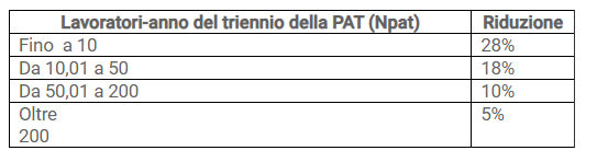 Ricordiamo che la riduzione del tasso medio di tariffa è inversamente proporzionale al numero di lavoratori/anno del triennio della PAT (posizione assicurativa territoriale), secondo i principi comunitari degli interventi in materia di sicurezza.