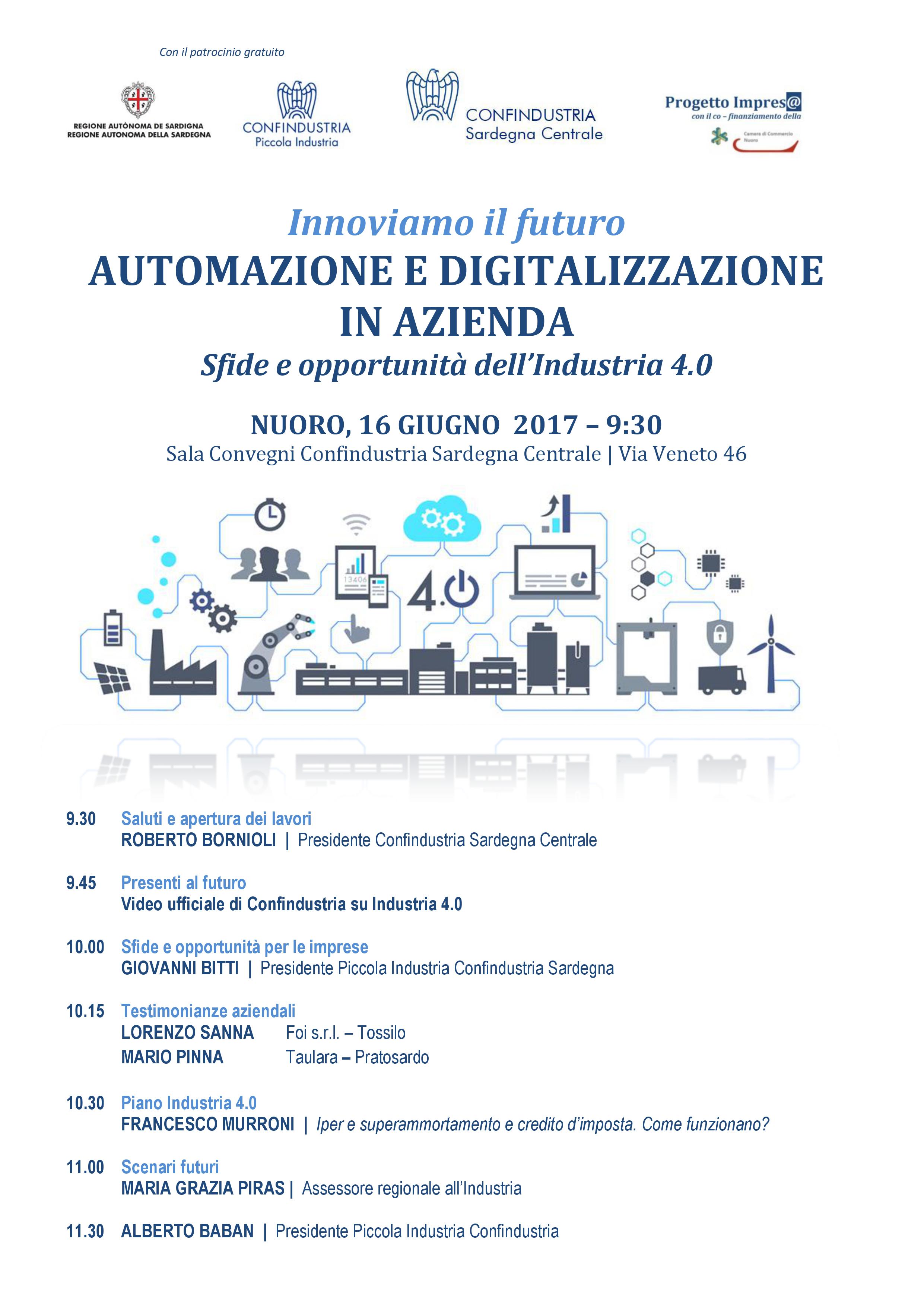 Questo evento è inserito nell'ambito del Progetto Impres@, un’iniziativa itinerante ideata e realizzata dalla nostra Associazione con il sostegno della Camera di commercio di Nuoro e ha l’obiettivo di promuovere le imprese della Sardegna Centrale e il suo territorio. La giornata di oggi è dedicata alle tematiche dell'innovazione e dell'Industria 4.0: puntare sull’innovazione tecnologica e adattare i modelli organizzativi ai nuovi scenari è fondamentale per competere nei mercati ed è indispensabile che le imprese siano attrezzate. È fondamentale capire le grandi trasformazioni in corso e conoscere le opportunità date dalle nuove tecnologie dell’Industria 4.0. Questi sistemi sono oggi disponibili a costi più bassi e la loro implementazione in azienda è sostenuta da importanti incentivi fiscali. Stiamo parlando di sistemi digitali, come per esempio, software, sensori, connessioni wireless, stampa 3D, e nuovi processi produttivi e organizzativi. Grazie a queste tecnologie, le fasi di produzione saranno guidate dalla gestione, dall’analisi e dall’uso intelligente di elevate quantità di dati, dall'uso di sistemi di intelligenza artificiale, robotica e molto altro. Sono tecnologie che coinvolgono non più soltanto le grandi realtà industriali ma soprattutto le piccole e le medie imprese che anche attraverso il Piano Industria 4.0 hanno l’opportunità di investire in sistemi digitali che possono rendere l’azienda più efficiente e competitiva. Attivato a marzo scorso, il programma di agevolazioni del Governo è stato fortemente richiesto da Confindustria proprio facilitare per gli investimenti e stimolare una maggiore produttività nelle aziende, anche in quelle più piccole. Ciò anche sulla scia di quanto accade in altri Paesi, come Stati Uniti, Francia e Germania che hanno già adottato provvedimenti a sostegno dell’innovazione digitale nelle PMI