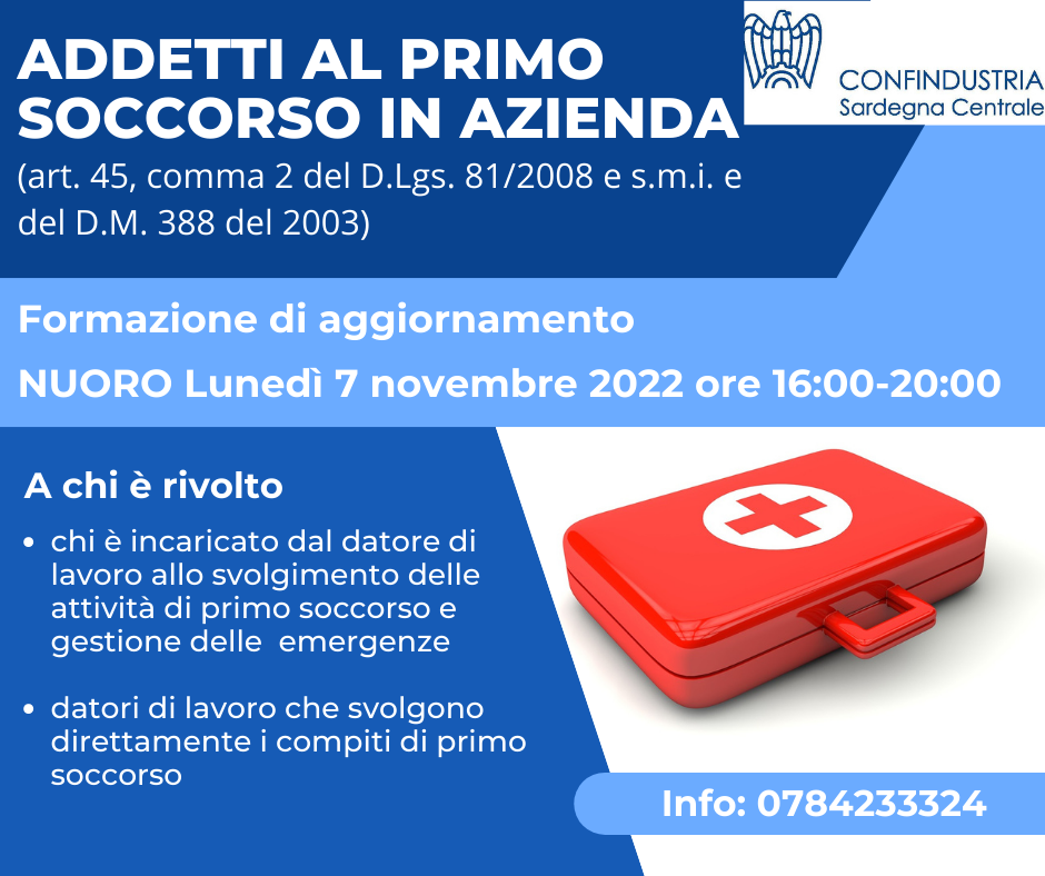 Corso di aggiornamento di primo soccorso in azienda a Nuoro in data 7 novembre 2022 dalle ore 16:00 alle 20:00. Per maggiori informazioni e per prenotare la partecipazione al corso vi invitiamo a scrivere ai nostri uffici all'indirizzo g.pittalis@assindnu.it.
