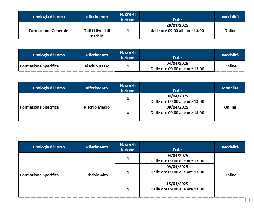 - I lavoratori delle imprese classificate a rischio medio dovranno frequentare 4 ore di formazione generale e 8 ore di formazione specifica.
