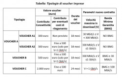 Sono previste quattro diverse tipologie di voucher, a seconda di parametri prestazionali (velocità massima in download e banda minima garantita) relativi all’offerta attivata, secondo lo schema seguente.
