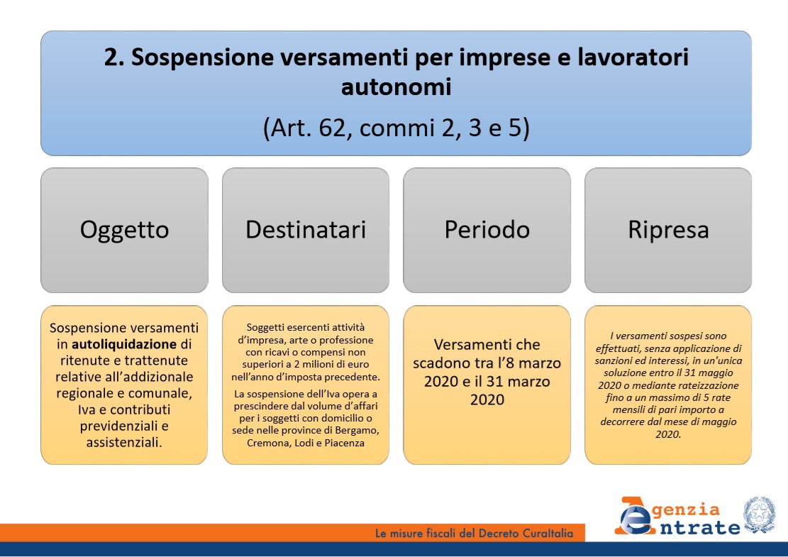 - per le imprese con fatturato non superiore ai 2 milioni di euro lo slittamento dei versamenti scaduti tra l'8 e il 31 marzo 2020. I versamenti possono essere pagati senza interessi e sanzioni entro il 31 maggio 2020 in un'unica soluzione o in 5 rate mensili a decorrere da maggio 2020, come descritto nella tabella di sintesi sotto indicata: