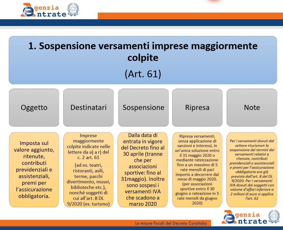 - stesso discorso per le imprese maggiormente colpite dall'emergenza sanitaria cosi come definite dall'art. 61 del DL 18/2020 "Cura Italia" (es. ristoranti, musei, tour operator, settore turistico e ricettivo in genere ma anche imprese del settore culturale)