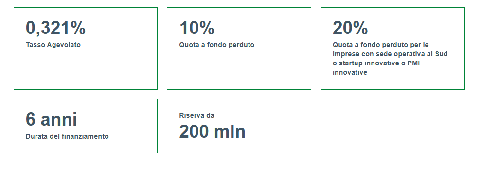 1) un finanziamento a tasso agevolato, della durata di sei anni, di cui due anni di preammortamento. In sede di presentazione della domanda, l’impresa può scegliere un tasso agevolato pari al 10%, 50% o 80% del tasso di riferimento UE;