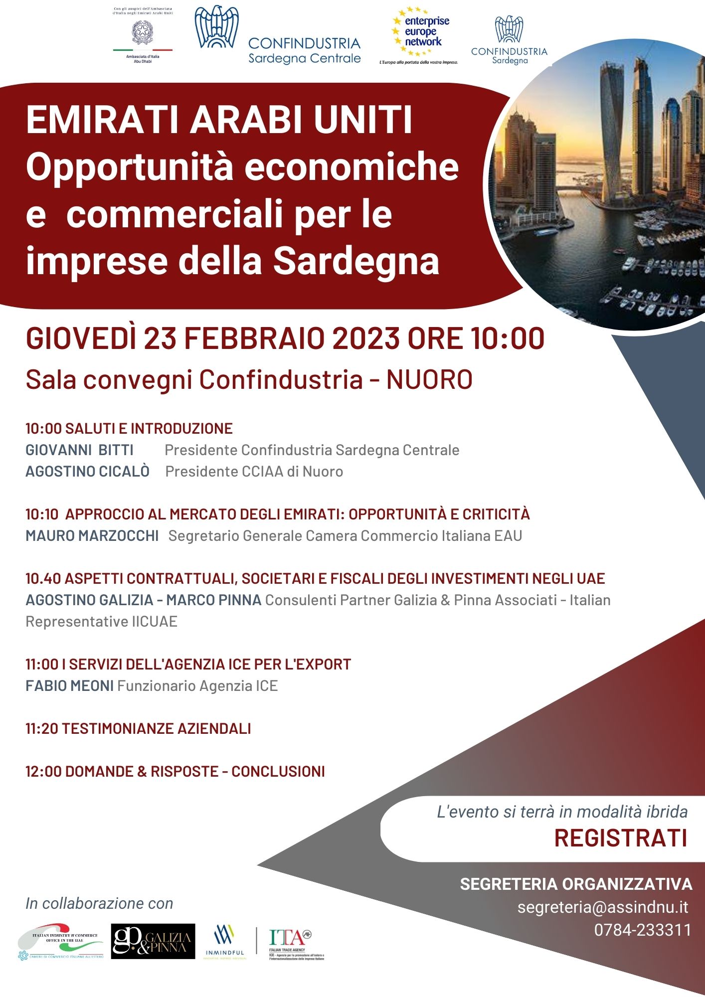 Insieme al Presidente di Confindustria Sardegna Centrale Giovanni Bitti e al Presidente della Camera di commercio di Nuoro Agostino Cicalò, partecipano il Segretario Generale della Camera di commercio italiana Emirati Arabi Uniti a Dubai Mauro Marzocchi; i consulenti Partner della Galizia & Pinna Associati certificati dalla Camera di commercio italiana a Dubai Agostino Galizia e Marco Pinna; il rappresentante dello Sportello dell’Agenzia ICE in Sardegna Fabio Meoni.