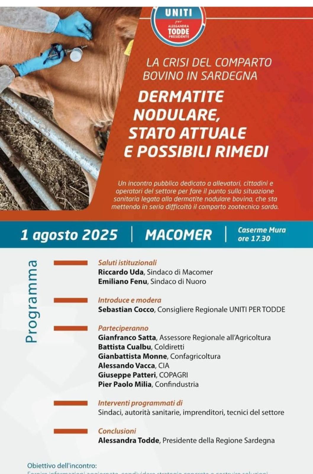 Venerdì prossimo 1° agosto il presidente Pierpaolo Milia parteciperà al convegno "Dermatite nodulare, stato attuale e possibili rimedi" che si terrà alle ex Caserme Mura con inizio dei lavori alle ore 17:30. L'incontro sarà l'occasione per fare il punto sulla situazione sanitaria legata alla dermatite bovina che sta mettendo in seria difficoltà il comparto zootecnico in Sardegna. Parteciperà tra gli altri la presidente della Regione Alessandra Todde. Il programma dei lavori è consultabile al seguente link clicca qui.