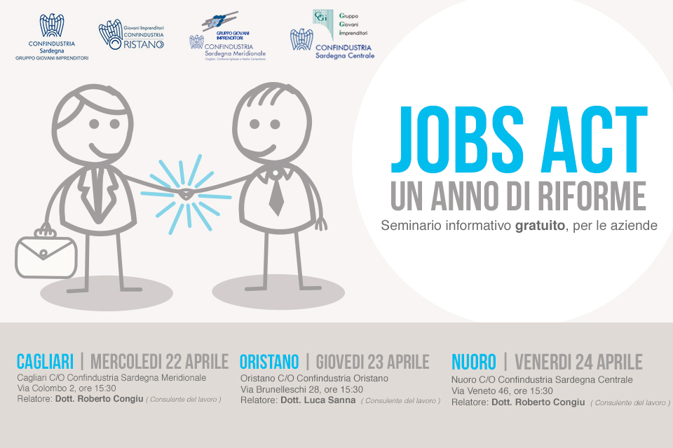 Siamo lieti di invitarvi al seminario informativo sul Jobs Act, che si terrà a Nuoro il prossimo 24 aprile, alle 15:30, nella sede della nostra Associazione. Il dott. Roberto Congiu, relatore dell’incontro, parlerà delle novità sul mercato del lavoro introdotte dalla Legge di Stabilità. L’iniziativa è realizzata dalla nostra Associazione in collaborazione con il Gruppo Giovani Imprenditori di Confindustria Sardegna.