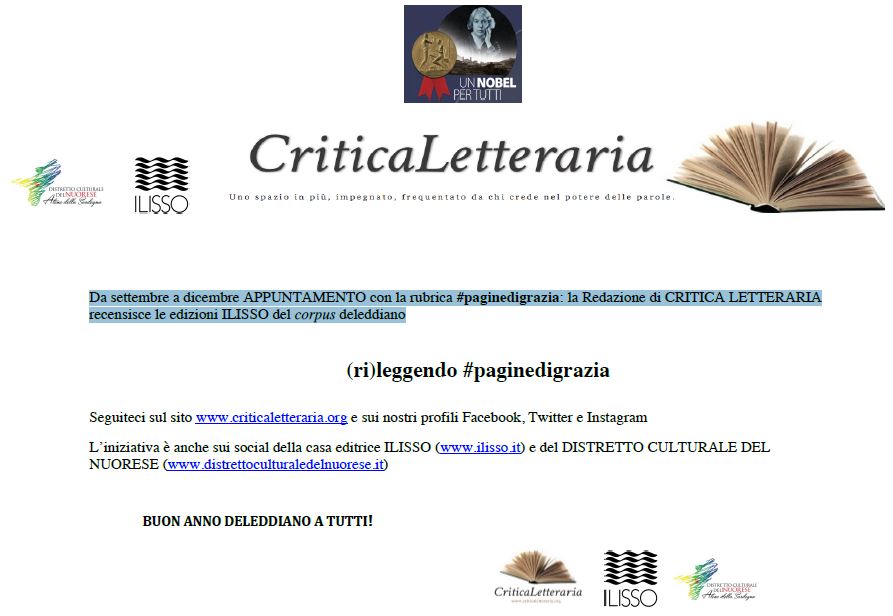 Dal mese di settembre al mese di dicembre, la Redazione di Critica Letteraria rileggerà e commenterà queste opere sulle pagine del sito www.criticaletteraria.org, nella rubrica dedicata #paginedigrazia. Un vero e proprio tam-tam di recensioni e suggerimenti scandito attraverso le storie, i personaggi, i luoghi e i grandi temi deleddiani. Tradizioni popolari di Nuoro, La via del male, Cenere, Canne al vento, Marianna Sirca, Colombi e sparvieri, La chiesa della solitudine, Elias Portolu, Cosima, La madre etc…