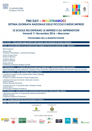Far crescere nelle giovani generazioni la consapevolezza del fondamentale ruolo sociale dell'impresa come motore di crescita, di sviluppo e di benessere collettivo. Con questo obiettivo, la nostra Organizzazione ha aderito quest'anno al PMI DAY 2016 - INDUSTRIAMOCI, la settima giornata nazionale delle piccole e medie imprese, dedicata alla promozione della cultura d'impresa. "Le scuole incontrano le imprese e gli imprenditori" è questo il tema dell'iniziativa che la nostra Associazione ha organizzato a Macomer in collaborazione con Piccola Industria Sardegna. La manifestazione - promossa da Piccola Industria di Confindustria in collaborazione con le Associazioni territoriali - si svolgerà in tutta Italia.