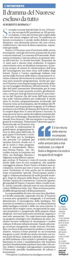 Intervento di Bornioli sulla Nuova Sardegna | Nuorese tra incompiute e scenari di rilancio