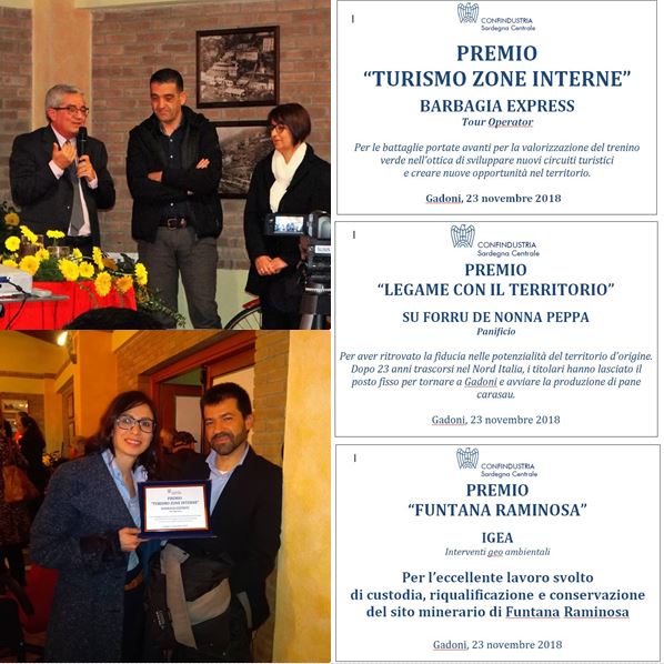 Infine l’ultimo premio "impresa lavoro" è stato consegnato all’azienda “Su Forru de Nonna Peppa”. Gli imprenditori Pasqualina e Massimiliano, che hanno avviato l’attività a Gadoni lasciando il posto fisso in Piemonte dopo 23 anni. Sono stati premiati per la loro iniziativa e per il loro coraggio. Ma anche perché questo è un esempio per il futuro di Funtana Raminosa e di Gadoni. Lo sviluppo turistico della miniera deve infatti sostenere l'economia e l'occupazione del paese e del territorio. Con la nascita di nuove imprese