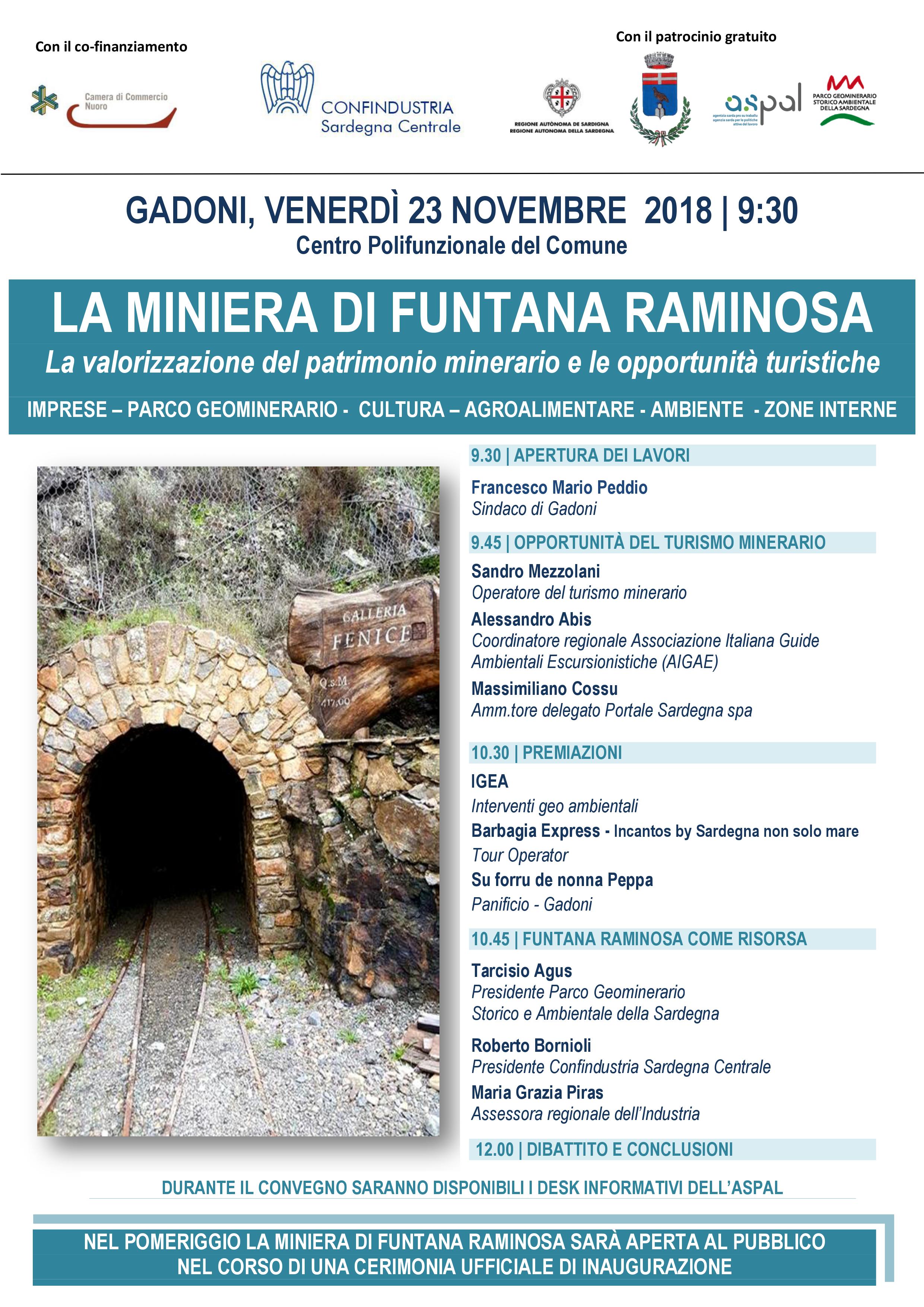 Il progetto “Turismo minerario. Un giacimento per l’occupazione e la crescita” co-finanziato dalla Camera di Commercio di Nuoro si è concluso a Gadoni il 23 novembre alle 9:30 nell’accogliente sala del centro polifunzionale del Comune. Questo secondo appuntamento, dopo l’evento realizzato a fine ottobre a Orani, si inserisce in una cornice istituzionale di grande rilievo. Nel pomeriggio dello stesso giorno, infatti, la miniera di Funtana Raminosa è stata aperta al pubblico nel corso di una cerimonia ufficiale di inaugurazione. LEGGI IL RESOCONTO DELLA GIORNATA