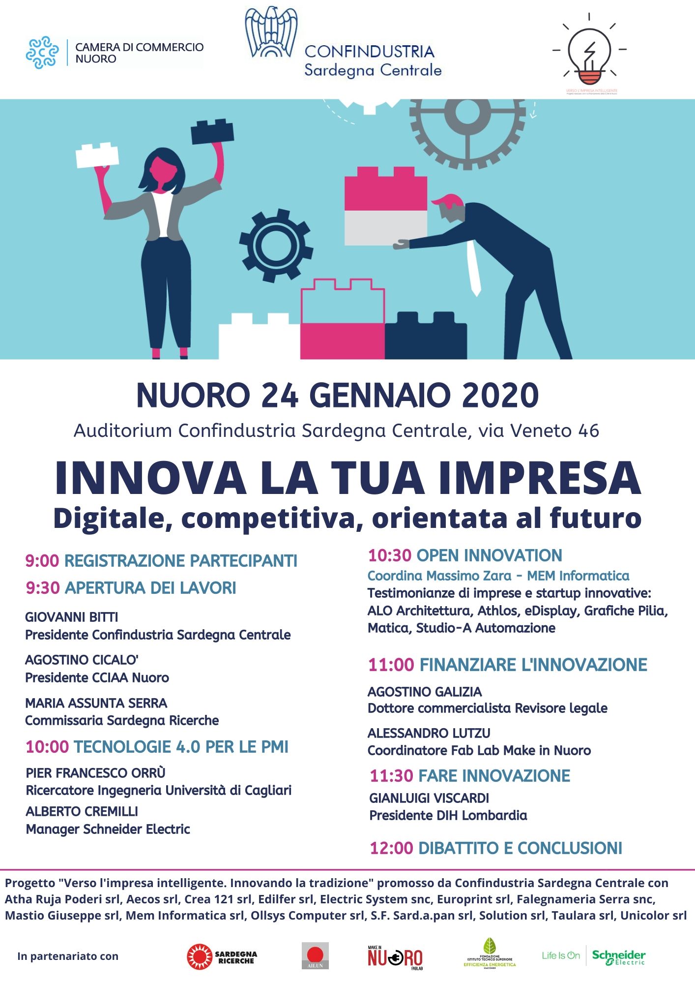 La prima giornata di promozione della cultura dell'innovazione in azienda si è tenuta a Nuoro nell'auditorium di Confindustria venerdì 24 gennaio 2020 dal titolo “Innova la tua impresa. Digitale, competitiva, orientata al futuro”