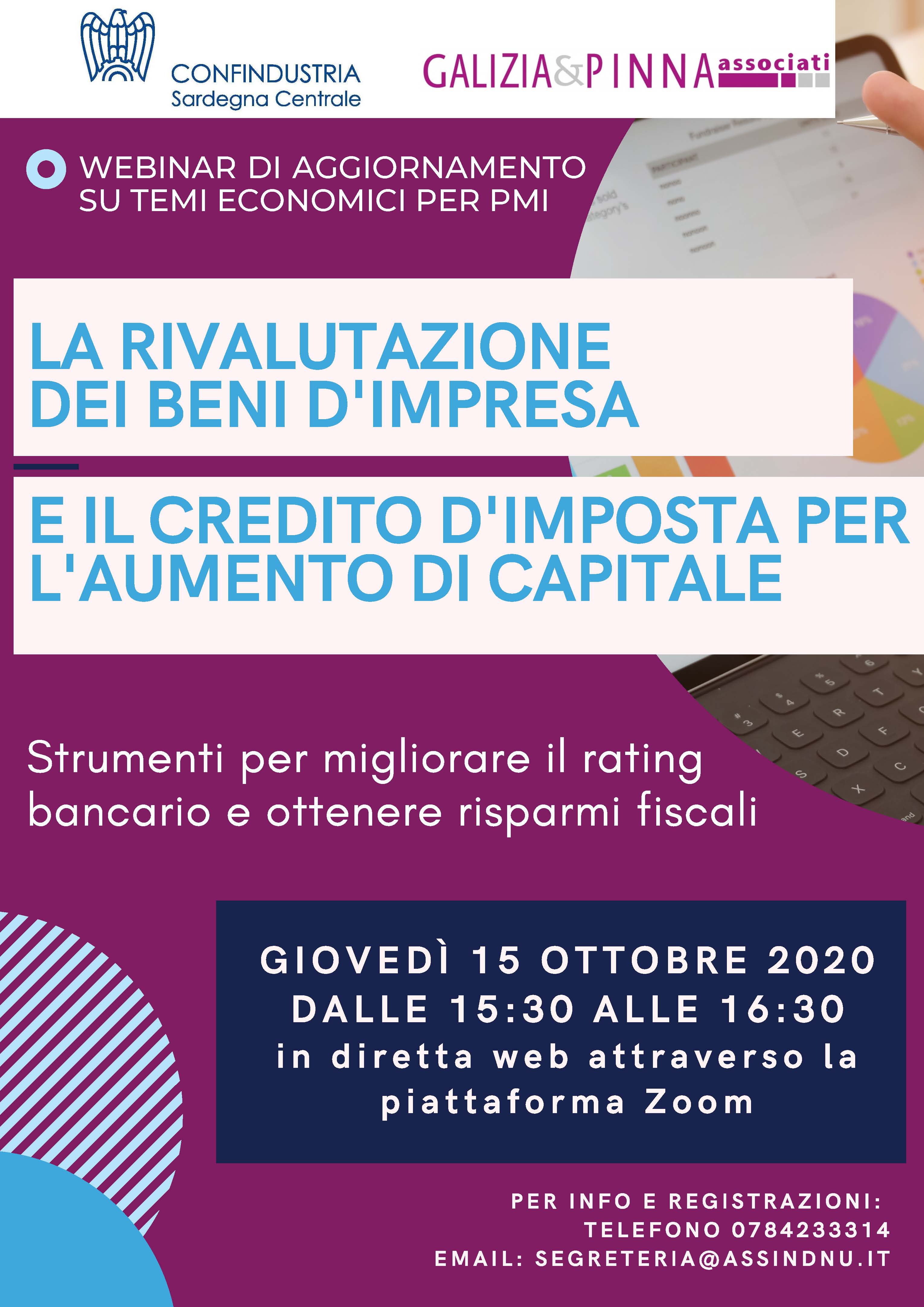 Il decreto Agosto dà alle imprese la possibilità di aumentare i patrimoni netti delle società mediante la rivalutazione dei beni di impresa e delle partecipazioni. La normativa introduce in materia importanti novità che saranno approfondite nel corso di un webinar promosso dalla nostra Associazione in collaborazione con lo Studio Galizia e Pinna in programma giovedì prossimo 15 ottobre 2020 dalle ore 15:30 alle 16:30. L'iniziativa è gratuita per le aziende associate a Confindustria. Iscrizioni entro mercoledì alle ore 12. Info: 0784233314.