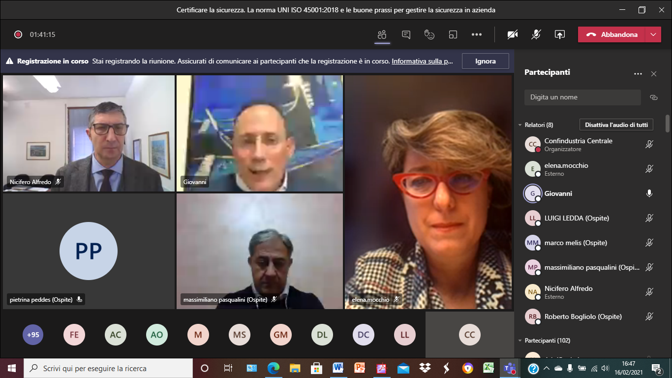 Grande partecipazione e interesse da parte di aziende e professionisti che ieri martedì 16 febbraio hanno partecipato al webinar “Certificare la sicurezza. La norma UNI ISO 45001 e le buone prassi per gestire la sicurezza in azienda”. È stata questa l'occasione per fare il punto sulle novità in materia di certificazioni legate alle norme per la sicurezza negli ambienti di lavoro. Al centro degli interventi un nuovo approccio alla gestione della sicurezza e della salute nelle aziende sempre più impegnate a rendere più efficiente la gestione della sicurezza, con una prospettiva che vada oltre l’adempimento legislativo. L'iniziativa è promossa da Confindustria Sardegna Centrale in collaborazione con la Direzione Regionale dell'INAIL Sardegna nell'ambito del progetto CERT(I)MPRESE finalizzato a promuovere buone prassi in tema di sicurezza sul lavoro e responsabilità sociale di impresa.