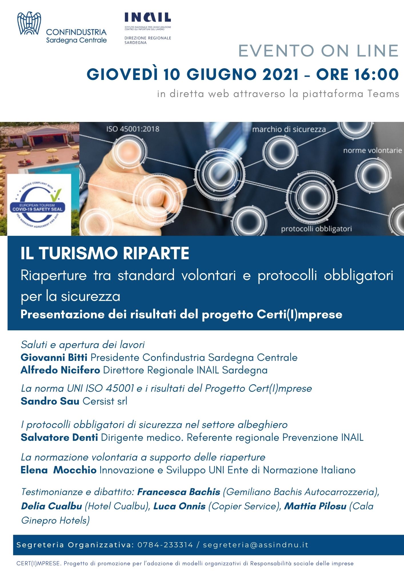 Riparte il turismo in Sardegna tra protocolli di sicurezza obbligatori e standard volontari. Il tema sarà approfondito nel corso del webinar IL TURISMO RIPARTE che si terrà giovedì prossimo 10 giugno alle ore 16:00 in diretta web su piattaforma Teams. Parleremo sia di Protocolli sanitari obbligatori per alberghi sicuri, sia di standard volontari condivisi volti a favorire la ripresa dei viaggi e sostenere la ripartenza dei flussi turistici. Nasce anche il nuovo marchio European Tourism Covid-19 Safety Seal messo a punto dalla Commissione europea per aiutare l'industria del turismo ad adattare i propri servizi alla nuova normalità garantendo il massimo della sicurezza e dell'affidabilità. Le misure adottate su base volontaria sulla stessa linea della norma UNI ISO 45001 affiancano i protocolli obbligatori messi a punto dall'INAIL e previsti dalla normativa nazionale. Nel corso del webinar saranno presentati i risultati del Progetto CERT(I)MPRESE nato per sensibilizzare le piccole e medie imprese sulla certificazione UNI ISO 45001 in materia di sicurezza. L'iniziativa è promossa e realizzata dalla Confindustria Sardegna Centrale in collaborazione con la Direzione regionale INAIL Sardegna. Per partecipare REGISTRATI AL WEBINAR.