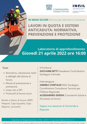 "Lavori in quota e sistemi anticaduta: normativa, prevenzione e protezione" è il tema al centro del prossimo laboratorio di approfondimento dedicato alle aziende del settore edile, metalmeccanico e nautico in programma giovedì 21 aprile alle ore 16 in modalità telematica. L'iniziativa rientra nell'ambito del progetto "In mani sicure: percorsi per lavorare in sicurezza" promosso dalla Confindustria Sardegna Centrale in collaborazione con la Direzione regionale della Inail Sardegna. Per partecipare è necessario registrarsi qui.
