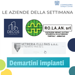 Le aziende della settimana sono la Vetreria F.lli Fais snc di Pratosardo, la Rolaan srl con sede a Tortolì, la Dessena Costruzioni attiva a Orosei, la Demartini Impianti di Macomer. Nata nel 1967 come piccola bottega artigiana la VETRERIA FRATELLI FAIS è diventata nel corso degli anni una delle ditte più importanti nel campo della lavorazione del vetro in Sardegna. La ROLAAN che festeggia quest'anno il 50° anni di attività è specializzata in attività di progettazione, costruzione, e manutenzione elettrica e meccanica. La DECOS invece si occupa di costruzione, ristrutturazione e gestione di immobili e la DEMARTINI IMPIANTI opera nel settore dell'impiantistica industriale.