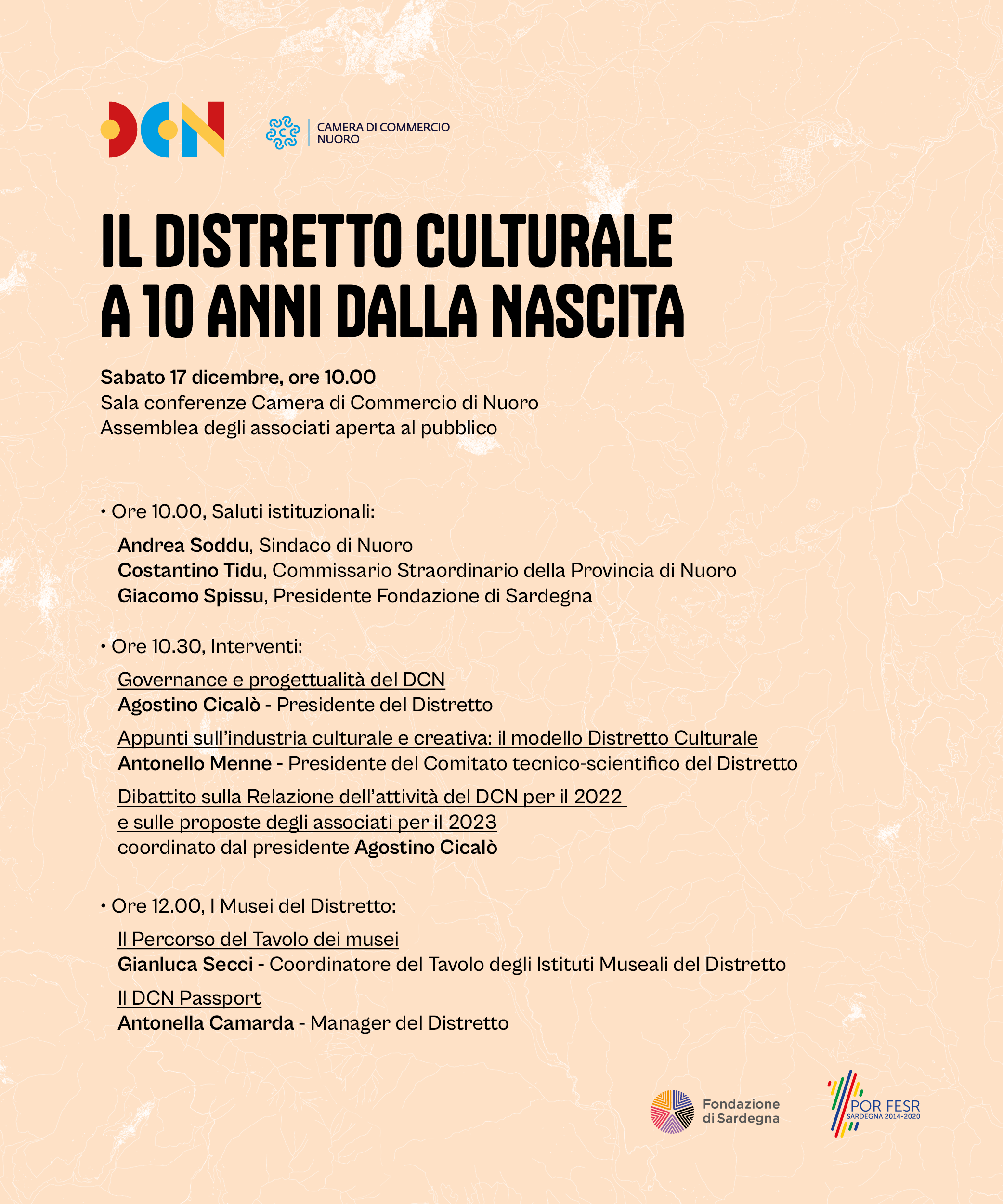 Sabato prossimo 17 dicembre alle ore 10 presso la Sala Conferenze della Camera di Commercio di Nuoro, il Distretto Culturale del Nuorese incontrerà gli associati, i rappresentanti dei luoghi della cultura, gli operatori culturali, i referenti dei Comuni e tutti i cittadini in occasione dell'Assemblea degli Associati che quest'anno si tiene nel decennale dalla costituzione del Distretto.