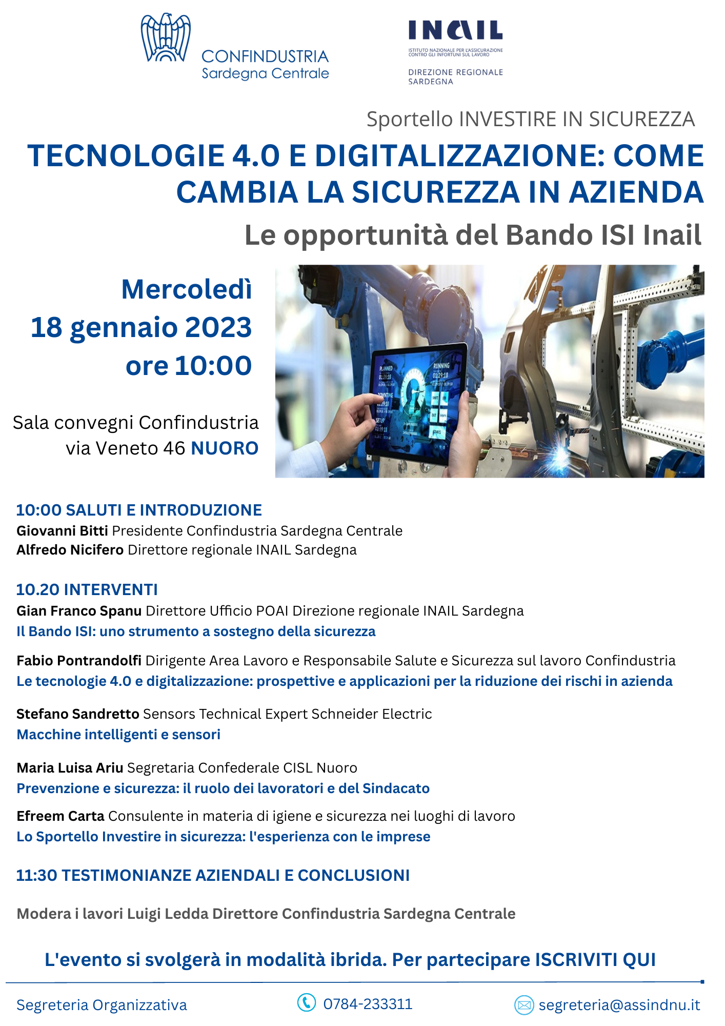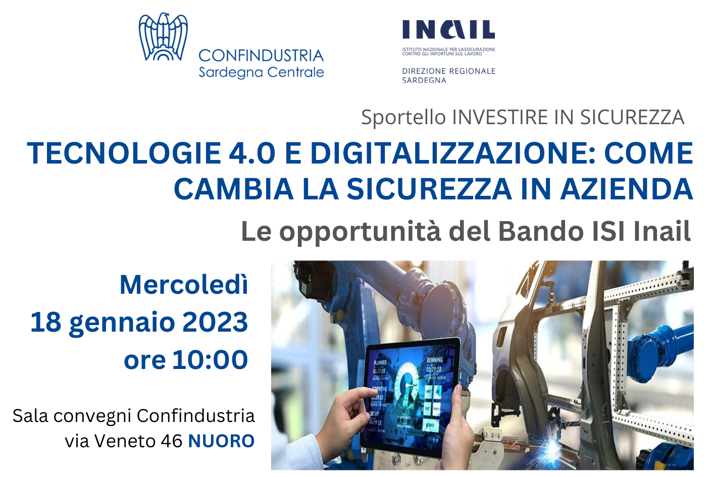 Le tecnologie 4.0 (intelligenza artificiale, robotica avanzata e altri strumenti e soluzioni digitali) stanno rivoluzionando la gestione delle attività lavorative in tutti i settori mostrando anche importanti potenzialità e sviluppi nell'organizzazione della sicurezza nei luoghi di lavoro. Le aziende che intendono investire per migliorare la sicurezza possono fare riferimento a un importante strumento di agevolazione il Bando ISI Inail che annualmente mette a disposizione delle piccole e medie imprese finanziamenti a fondo perduto a sostegno di progetti di investimento volti a ridurre i livelli di rischio nei luoghi di lavoro. Sono questi i temi al centro del seminario “Tecnologie 4.0 e digitalizzazione: come cambia la sicurezza in azienda. Le opportunità del Bando ISI Inail” che si terrà mercoledì 18 gennaio 2023 nella sede di Confindustria a Nuoro, con inizio dei lavori alle ore 10:00. Sarà anche l'occasione per fare il punto sul funzionamento del Bando ISI e sulle opportunità offerte da questa misura alle PMI in tema di salute e sicurezza.