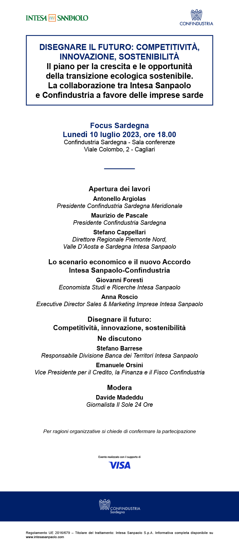 Le imprese associate sono invitate a partecipare lunedì 10 luglio alle ore 18:00 a Cagliari nella sala conferenze di Confindustria Sardegna all'evento FOCUS SARDEGNA nell'ambito dell'iniziativa DISEGNARE IL FUTURO: COMPETITIVITA, INNOVAZIONE, SOSTENIBILITA Il piano per la crescita e le opportunità della transizione ecologica sostenibile promosso nell'ambito della collaborazione tra Intesa Sanpaolo e Confindustria a favore delle imprese. Nel corso dell'iniziativa sarà presentato il nuovo accordo tra Confindustria e Intesa San Paolo che ha messo a disposizione delle imprese italiane 150 miliardi di euro a livello nazionale per promuovere la transizione del sistema produttivo verso tre driver fondamentali per la crescita in coerenza con il PNRR: innovazione e transizione digitale, sostenibilità, rafforzamento patrimoniale e sostegno alle filiere. Consulta qui il programma dei lavori.